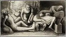 At the start of the Second World War, Hughes-Stanton, like many other artists, undertook camouflage work before he enlisted in the British Army.[9] In 1940 he joined the Royal Engineers. He served in the Middle East and then transferred to Greece, where he was captured. An over zealous prison guard in the temporary P.O.W. camp at Corinth shot him in the throat and skull when he strayed too close to the camp wire. His injury incapacitated him and he was moved to a series of camps in Germany, and he was finally repatriated to Britain in August 1943. Back in England he wrote to the War Artists' Advisory Committee (WAAC) in November 1943, seeking a painting commission. After a meeting with Kenneth Clark, the chairman of WAAC, he was given a commission to paint three pictures based on his experiences as a POW. After Blair-Stanton completed these, WAAC purchased two more pictures from him.[10]