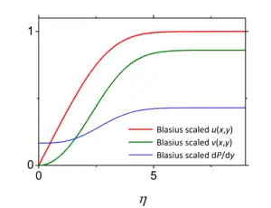 Where the prime denotes derivation with respect to . Substitution into the -momentum equation gives the Blasius equation