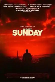 Bloody Sunday is a 2002 British-Irish film written and directed by Paul Greengrass based around the 1972 "Bloody Sunday" shootings in Derry, Northern Ireland. Although produced by Granada Television as a TV film, it premiered at the Sundance Film Festival on 16 January, a few days before its screening on ITV on 20 January, and then in selected London cinemas from 25 January. Though set in Derry, the film was mostly shot in Ballymun in North Dublin, with some location scenes were shot in Derry, in Guildhall Square and in Creggan on the actual route of the march in 1972.