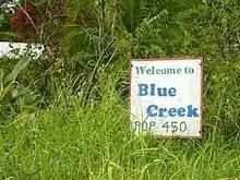 Blue Creek is a village in the Toledo District of Belize. it is a Mopan people and Kekchi village of about 270 people. The community lies along flat roads, spanning both sides of Blue Creek. Clusters of thatch huts border both sides of Blue Creek, a beautiful, clear stream emerging from the surrounding thick jungle. The colour of blue-green pool where Maya women beat their laundry on the smooth stones gave the village its name. The banks are lined with tall shady trees. The reflection of the thick jungle rainforest, which lines both sides, is clearly visible in the surface of the creek.