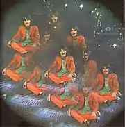 The filming took place in an aircraft hangar, with the scene designed to re-create a typically smog-ridden Los Angeles.[79] Music journalist Kit O'Toole writes that the smoke surrounding Harrison "almost engulf[s] him, mimicking the 'fog' described in the lyrics".[52] Through the use of prismatic photography,[18] the "Blue Jay Way" segment also shows Harrison's "image refracted as if seen through a fly's eye", according to author Alan Clayson, who describes the scene as mirroring "the requisite misty atmosphere" suggested by the recording.[78][nb 8] In its preview of Magical Mystery Tour in 1967, the NME highlighted the segment as one of the film's "extremely clever" musical sequences, saying: "For 'Blue Jay Way' George is seen sitting cross-legged in a sweating mist which materialises into a variety of shapes and patterns. It's a pity that most TV viewers will be able to see it only in black and white."[81]