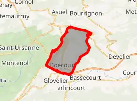 Boécourt has an area of 12.35 km2 (4.77 sq mi).[4] Of this area, 6.09 km2 (2.35 sq mi) or 49.3% is used for agricultural purposes, while 5.09 km2 (1.97 sq mi) or 41.2% is forested. Of the rest of the land, 1.06 km2 (0.41 sq mi) or 8.6% is settled (buildings or roads), 0.04 km2 (9.9 acres) or 0.3% is either rivers or lakes and 0.03 km2 (7.4 acres) or 0.2% is unproductive land.[5]