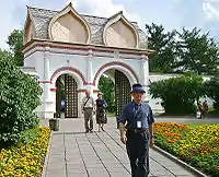 Stone gates in Kolomenskoye, covered with wooden double cross bochka roof. 17th-century.