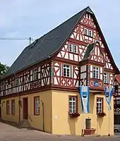 - Without a doubt, the municipality’s centrepiece is the Town Hall, which the knightly monastery had built in 1608 as a new courthouse (for the higher and village court). The two-floor building with a gabled roof and lovely indoor stucco work is typical of Franconian-Hessian timber-frame construction of the Renaissance after 1555. The massively built ground floor was originally an open hall with a round-arch opening (remnants were brought to light in 1968). The in parts “disordered” timber-frame structure over the entrance suggests that there was once an outdoor stairway up to the first floor. All cornerposts, the odd slanted beam, various crossbeams and the whole oriel are covered in vine and grape carvings, mouldings and grotesque faces. On a windowpost facing the Rhine, the names of the Schultheiß (roughly “sheriff”) and the Schöffen (roughly “lay jurists”) in the year when the Town Hall was built can still be made out.