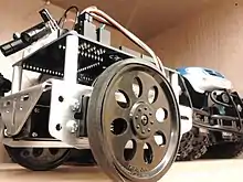 The green detachable main circuit, mounted on the top of the robot is called the Board of Education . The microcontroller which plugs into a socket on the green circuit board is called the BASIC Stamp . The BASIC Stamp is programmed in PBASIC. The rear wheel is a drilled polyethylene ball held in place with a cotter pin. Wheels are machined to fit on the servo spline and held in place with a screw. The BASIC Stamp is easy to program.[1] The Boe–Bot is small, approximately four inches wide, and runs on four AA batteries. It is well documented.[2]