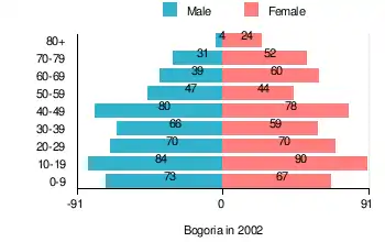According to the 2002 Poland census, there were 1,038 people residing in Bogoria village, of whom 47.6% were male and 52.4% were female. In the village, the population was spread out, with 26.6% under the age of 18, 37.6% from 18 to 44, 17.2% from 45 to 64, and 18.6% who were 65 years of age or older.[1]