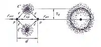 According to his model for a diatomic molecule, the electrons of the atoms of the molecule form a rotating ring whose plane is perpendicular to the axis of the molecule and equidistant from the atomic nuclei. The dynamic equilibrium of the molecular system is achieved through the balance of forces between the forces of attraction of nuclei to the plane of the ring of electrons and the forces of mutual repulsion of the nuclei. The Bohr model of the chemical bond took into account the Coulomb repulsion - the electrons in the ring are at the maximum distance from each other.[2]