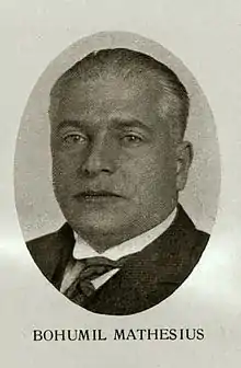 Bohumil Mathesius (July 14, 1888 – June 2, 1952) was a Czech poet, translator, publicist and literary scientist – expert on Russian literature. He was a professor at the Faculty of Arts of the Charles University in Prague. His cousin was Vilém Mathesius.
