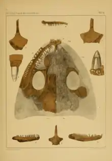 The palate (roof of the mouth) also possesses teeth. The palatine bones, positioned right next to the maxillae, possess a fair number of teeth. The most notable assortment of palatal teeth are a bundle of large fangs preserved midway down the skull. Large palatal fangs are also shared by Sparodus, explaining how Boii crassidens was once considered to be part of that genus. Frič (1883) considered these fangs to have grown out of the vomers (from the front of the skull) or possibly the parasphenoid (from the back of the skull),[3] but Carroll (1966) reconstructed the fangs as being part of the long pterygoid bones, which were originally reported as being toothless.[4][2] The dentaries (main bones of the lower jaws) are also preserved and covered with teeth similar to those of the upper jaws. A row of small pits run from the symphysis (chin) along the upper portion of the outer face of the bones.[4]