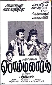 Bommalattam (transl. Puppet Show) is 1968 Indian Tamil-language comedy film, directed by Muktha Srinivasan and produced by V. Ramasamy. The script was written by Cho Ramaswamy. Music was by V. Kumar. It stars Jaishankar, Jayalalithaa, Nagesh, Major Sundarrajan, Cho Ramaswamy and Manorama. V. S. Raghavan, Sachu and O. A. K. Thevar play key roles. The film was released on 31 May 1968.[2]