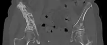 | 3D rendered CT scan of bone metastases of the hip bone, in a 60 year old woman with parotid gland cancer. Large lesions are seen on the ilium on the more distant side. Involvement of the vertebral column has caused a compression fracture. | |