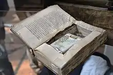 The custom of binding several wax tablets together (Roman pugillares) is a possible precursor of modern bound (codex) books.[7] The etymology of the word codex (block of wood) also suggests that it may have developed from wooden wax tablets.[8]