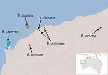 The westernmost species, B. capensis, occurs throughout the North West Cape. B. furcosus is known from Mount Minnie, in the Pilbara region. B. undulatus and B. delicatus co-occur in an area of Pilbara, the only two sympatric species of the genus. Furthest east is B. curiosus is only known from the Mount Elvire area in Pilbara. The sixth species, B. dubitalis, occurs only on Barrow Island, where it is widespread and abundant.[2]