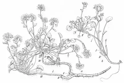 From Ostenfeld's "The land-vegetation of the Færöes", Fig. 171 "Perennial specimens of Cochlearia officinalis from a wet rock-ledge at Trangisvaag on Syderö, 9th May 1895. I. Stem-rudiments from the first period of flowering. II. from the second period. III. stem with flowering scapes of the third period. i. long internodes. a. specimen at least 4 years old, probably 5 years. b. specimen at least 3 years old, probably 4 years."