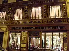 In France, a bouillon (French: bouillir, English: to boil) is a traditional (late 19th or early 20th century), spacious restaurant that usually serves traditional French cuisine, in particular a Bouillon (broth) which has provided the name for this class of restaurants.