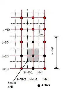 The equations are solved for cells up to NI-1, outside the domain values of flow variables are determined by extrapolation from the interior by assuming zero gradients at the outlet plane