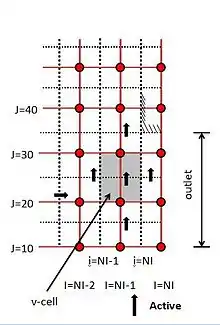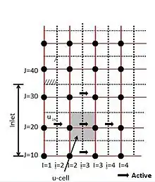 - For the first u, v, φ-cell all links to neighboring nodes are active, so there is no need of any modifications to discretion equations.