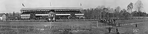 The Bowie Race Track was a horse racing track located just outside the city limits of Bowie, Maryland. The one mile oval racetrack, known as Prince George's Park, was opened October 1, 1914 under the auspices of the Southern Maryland Agricultural Society—in actuality the track's owners were famous Baltimore confidence men Gad Brian and Jim O'Hara.[2][3] A major attraction in the area, easy access for racetrack patrons was available from the WB&A Railroad which ran trains every five minutes from the Liberty Street Station in Baltimore for which they charged 65¢ for a round-trip ticket. Admission to the grounds and grandstand was $1.00.[4]