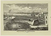 The park was described in 1926 as having "walks, benches, sumac trees and poorly-kept [sic] lawns", as well as a fountain in the center used by local children to cool off in the summer.[16] It suffered neglect after World War II. Starting in 1972, the city renovated Bowling Green to restore its 17th-century character.[17] In conjunction with the park's renovation, the Bowling Green subway station underneath the park was expanded, necessitating the temporary excavation of the park.[18] The renovation faced a lack of funds during the 1975 New York City fiscal crisis[19] but was completed in the late 1970s.[20]