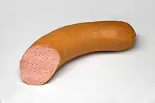 Brühwurst ("scalded sausage" or "parboiled sausage") is the collective name for several types of sausages according to the German classification.[1] They are a cooked sausage that are scalded[2] (parboiled),[3] as opposed to being raw. They are typically prepared from raw meat that is finely chopped, are sometimes smoked, and are typically served hot.[3][4]
