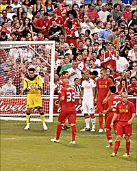 On 17 August 2010, Jones joined Liverpool in a deal worth £2,300,000. He qualified as a "home-grown" player under the new Premier League rules.[8] On 19 August, Jones watched Liverpool's UEFA Europa League play-off 1st leg tie at Anfield from the directors' box, along with captain Steven Gerrard, Emiliano Insúa, Alberto Aquilani and Dirk Kuyt. He was handed the number 1 shirt after goalkeeper Diego Cavalieri left the club on 23 August, ahead of Liverpool's clash with Manchester City. Jones made his unofficial debut in Jamie Carragher's testimonial against an Everton XI and impressed with a string of saves.[9] Jones made his debut for Liverpool in the League Cup 3rd Round tie against Northampton Town on 23 September 2010. The game ended 2–2 after extra time before Liverpool lost on penalties. A couple of weeks later, Jones injured his shoulder in training and was out for up to a month. Reserve goalkeeper Martin Hansen took his place on the bench until Jones was back fit, as Liverpool's other backup goalkeeper Péter Gulácsi was on loan at nearby club Tranmere Rovers. He made his second start for the club on 15 December 2010, in a Europa League game against Utrecht, getting his first clean sheet for the Reds. Unfortunately for Jones, this was to be his last game of the 2010–11 season.