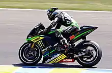 Smith signed with the Polaris World Aprilia team for the 2008 season.[9] He secured his first pole position at the opening round of the season at the Losail International Circuit in Qatar on 8 March,[10] but suffered a technical problem while leading.[11] A number of midseason injuries affected him,[12] but he scored podium finishes at Jerez and Le Mans (after briefly leading the five-lap sprint required by a red flag for rain). He led at both Assen and Sachsenring, but finished off the podium in both. He ended the season sixth overall, with three poles and four podium finishes but no victory.