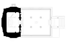The modern mandapa hall has four pillars reused from the original mandapa. They are octagonal and has carvings of bells and chains with band of kirtimukha faces on the top. The doorway can be original or the modern one. It has floral patterns and minor sculptures. The dedicatory block in the centre has Ganesha.[1]