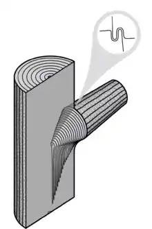 The basis of Shigo's model was that the branch base grew first, then the branch's base was overlapped by the growth of the trunk, and the further development of overlapping layers of these two distinct xylem tissues resulted in the development of a strong connection (Fig. 3). However, this model does not take into account the anatomy of tree forks, nor when tree growth is continuous (such as in tropical trees) and it requires contortions of the vascular cambium that are infeasible.[10][11]