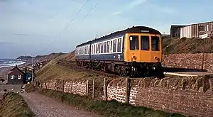 The Whitehaven and Furness Junction Railway was authorised in 1847 for a line which would link the town of Whitehaven with the Furness Railway at Broughton-in-Furness.[2] It was opened in stages, and the first section, that between Whitehaven and Ravenglass opened either on 1 June 1849[3] or on 21 July 1849.[4] The station was host to four LMS caravans from 1937 to 1939.[5]