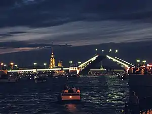 A familiar view of Saint Petersburg is a drawbridge across the Neva. Every night during the navigation period from April to November, 22 bridges across Neva and main canals are drawn to let ships pass in and out of the Baltic Sea into the Volga-Baltic waterway system. A calculated schedule with precise time of consecutive opening and closing for each bridge is maintained to guarantee passage of cargo ships and tankers at a precisely controlled speed, in order to have at least one bridge at a time staying connected to ensure passage for firefighters, police, ambulances and other ground transportation.