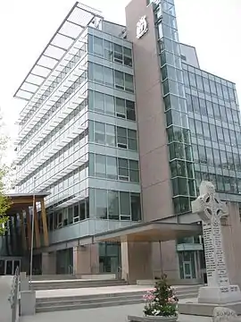 In 1947–48 the Lulu Theatre opened.[12] In 1958, the municipality purchased the racetrack from the BC Turf and Country Club, developing it to become Minoru Park. Opening within the park area were the then outdoor Centennial Pool (1958), running track (1960), sports pavilion (1964–2014), stadium rink (1965),[13] library (1976–1992),[12] aquatic centre (1977), and activity centre (1986-2019).[13] The Cultural Centre (1993) houses the library Brighouse branch, arts centre, archives, and museum.[14] The Caring Place (1994–2019) provided social services. On the east side of Minoru Blvd., Richmond Square Shopping Centre (1963) later developed into Richmond Centre. Sears, the anchor in the southern section, closed (2015). High-rises will replace the vacant store and carpark building.[12] On the No. 3 Rd/Granville corner, city hall was rebuilt (2000).[15]