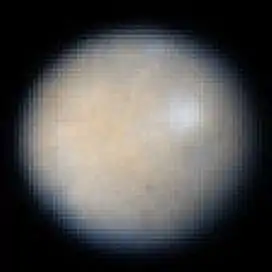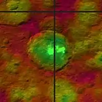 The brightest cluster of spots ("Spot 5") is located in an 80-kilometer (50 mi) crater called Occator.[1][2] The largest and brightest component of the cluster is in the center of the crater, with dimmer spots located towards this crater's eastern rim. Early in the orbital phase of the Dawn mission, the high albedo of these spots was speculated to be due to some kind of outgassing,[3] and subsequent closer images helped scientists determine that it is a material with a high level of reflection, and suggested ice and salt as possibilities.[4] These bright features have an albedo of about 40%, four times brighter than the average of Ceres's surface.[5]