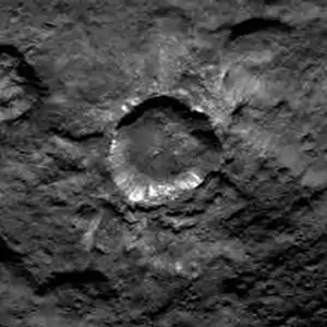 The spot in the center of the crater is named Cerealia Facula,[16] and the group of spots to the east - Vinalia Faculae.[17] These names were approved by International Astronomical Union 26 November 2016.