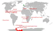 ![]() All areas of the world that were ever part of the British Empire. Current British Overseas Territories have their names underlined in red. |
