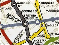 British Museum station was opened on 30 July 1900 by the Central London Railway (CLR; now the Central line), with its entrance located at No. 133, High Holborn (now a branch of the Nationwide Building Society), near the junction with New Oxford Street.[1] In December 1906, Holborn station was opened by the Great Northern, Piccadilly and Brompton Railway (GNP&BR; now the Piccadilly line) less than 100 yards away. Despite being built and operated by separate companies, it was common for the underground railways to plan routes and locate stations so that interchanges could be easily formed between services. This had been done by other lines connecting with the CLR stations at Oxford Circus and Tottenham Court Road, but an interchange station was not initially constructed between the GNP&BR and the CLR because the tunnel alignment to British Museum station would not have been suitable for the GNP&BR's route to its Strand station (later renamed Aldwych). The junction between High Holborn and the newly constructed Kingsway was also a more prominent location for a station than that chosen by the CLR.