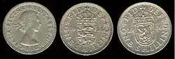 | Five pence[lower-alpha 1] | Queen Elizabeth II | Crowned thistle (1968-2008) Segment of the Royal Arms (2008-present) |