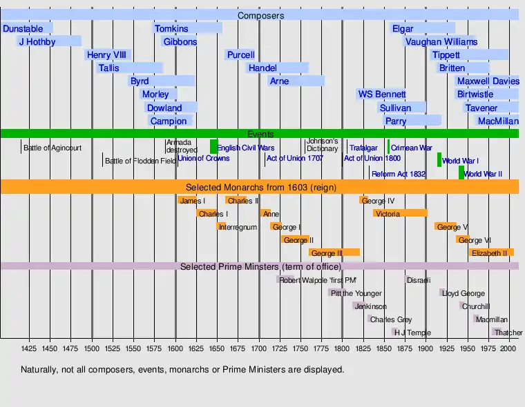 The Baroque era in music, between the early music of the Medieval and Renaissance periods and the development of fully fledged and formalised orchestral classical music in the second half of the eighteenth century, was characterised by more elaborate musical ornamentation, changes in musical notation, new instrumental playing techniques and the rise of new genres such as opera. Although the term Baroque is conventionally used for European music from about 1600, its full effects were not felt in Britain until after 1660, delayed by native trends and developments in music, religious and cultural differences from many European countries and the disruption to court music caused by the Wars of the Three Kingdoms and Interregnum.[16] Under the restored Stuart monarchy the court became once again a centre of musical patronage, but royal interest in music tended to be less significant as the seventeenth century progressed, to be revived again under the House of Hanover.[17]