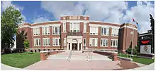 The school's basement had cloakrooms for pupils and a furnace room. The main floor had an office and a library in a shallow extension at the front and three classrooms on the north. The second floor held a laboratory above the office, and an assembly room and one classroom. The third floor had two gyms for boys and girls.