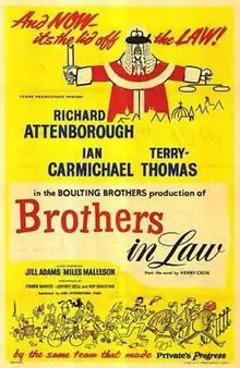 Brothers in Law is a 1957 British comedy film directed by Roy Boulting and starring Richard Attenborough, Ian Carmichael, Terry-Thomas and Jill Adams.[1] The film is one of the Boulting brothers successful series of institutional satires begun with Private's Progress in 1956.[2] It is an adaptation of the 1955 novel Brothers in Law by Henry Cecil, a comedy set in the legal profession.[3]