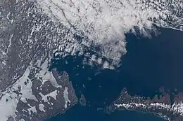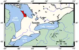 The Bruce Peninsula is a peninsula in Ontario, Canada, that divides Georgian Bay of Lake Huron from the lake's main basin. The peninsula extends roughly northwestwards from the rest of Southwestern Ontario, pointing towards Manitoulin Island, with which it forms the widest strait joining Georgian Bay to the rest of Lake Huron. The Bruce Peninsula contains part of the geological formation known as the Niagara Escarpment.