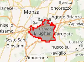 Brugherio (Italian pronunciation: [bruˈɡɛːrjo]; in Lombard: Brughee [bryˈɡeː]) is a comune (municipality) in the Province of Monza and Brianza in the Italian region Lombardy, located about 10 kilometres (6 miles) northeast of Milan. It was established December 9, 1866 unifying the suppressed municipalities of Baraggia, San Damiano and Moncucco (which nowadays are frazioni of Brugherio), together with the villages of Bindellera, Cesena, Gelosa, San Paolo, Torazza, Occhiate and Increa.[3][4]