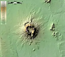 Brukkaros Mountain (Khoekhoe: Geitsi Gubib) is a collapsed caldera in ǁKaras Region, Namibia. Measuring 1,590 metres at its peak on the eastern edge of the crater, Brukkaros is located about 15 kilometres northeast of the primarily Nama town of Berseba and 100 kilometres north-northwest of Keetmanshoop.[1] It is over 650 metres taller than the surrounding area, but the crater floor is 350 m below the rim.
