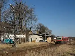 The tracks on the Bad Bodenteich–Wieren section were relaid in July 2011 on a ten-kilometre section from Vorhop towards Neudorf-Platendorf via Wahrenholz in the autumn of 2012. At the same time, the freight tracks in Wahrenholz station were dismantled (this part of the station was formerly called the Ölbf., "oil station",[2] as it was used for the loading of oil from the town’s two oil wells). The renewal of the tracks between Vorhop and Stöcken followed in 2013, with the simultaneous upgrading of all sets of points on the former freight tracks of Wittingen station. In addition, the points for the crossing loop in Bad Bodenteich and the entire length of track 2 including the sets of points in Gifhorn Stadt were renewed. In 2014, the track was renewed between Stöcken and Bad Bodenteich, where it connects with the subsequently constructed island platform, which enables the crossings of the few trains that have run hourly since December 2014. Platform 1, next to the station building, which had been dismantled at the time of the "hedgerow semi-fast trains,"[3] was rebuilt. The platforms were adapted in whole or in part to the entry height of the new railcars in the stations of Gifhorn Stadt, Neudorf-Platendorf, Wahrenholz and Knesebeck.