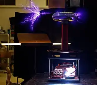 A brush discharge is an electrical disruptive discharge similar to a corona discharge that takes place at an electrode with a high voltage applied to it, embedded in a nonconducting fluid, usually air. It is characterized by multiple luminous writhing sparks, plasma streamers composed of ionized air molecules, which repeatedly strike out from the electrode into the air, often with a crackling sound.[1][2] The streamers spread out in a fan shape, giving it the appearance of a "brush".