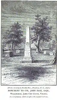 Colonel Page donated a plot of land about 144 feet (44 m) by 180 feet (55 m) and funds for building a brick church and for the surrounding churchyard in 1678. In return for his donation of land and funds towards the new church, Col. Page was allowed to have his family seated in a special pew at the front of the church in the chancel ahead of the congregation.[11]