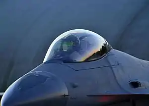 Numerous jet-powered fighter aircraft of the postwar era adopted bubble canopies. One of the more prominent external differences between the ground-attack orientated Hawker Siddeley Harrier and the later British Aerospace Sea Harrier, a navalised fighter derivative of the former, was the adoption of an elevated cockpit within a bubble canopy, granting superior exterior visibility to the pilot.[8] The General Dynamics F-16 Fighting Falcon also adopted a frameless bubble canopy in conjunction with a raised and reclined seat that granted unobstructed forward and upward vision.[9] The canopy of the F-16 comprises a single piece of bird-proof polycarbonate; it lacks the forward bow frame found on many fighters, which is an obstruction to a pilot's forward vision.[10][11] Bubble canopies were also incorporated into the Lockheed Martin F-22 Raptor[12] and the Eurofighter Typhoon, both being fighters oriented towards the aerial supremacy role.[13]