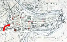 Since the construction of the Obertor in 1625/26, the area between the Obertor and the Christoffelturm was known as Zwischen den Toren (between the gates). From 1858 until 1898 the plaza was known as Christoffelplatz. Then, in 1898 it was renamed after Adrian von Bubenberg, the mayor (Schultheiss) of Bern in 1468-1469, 1473–1474 and 1477–1479 and the hero of Battle of Murten.[1] The Bubenberg memorial and fountain was built by Max Leu in 1897 and originally stood at the entrance to Bubenbergplatz.[2] In 1930 the plaza was rebuilt with a new tram station and the memorial was moved to the west. The new location of the fountain and memorial was at the entrance of Hirschengraben road with the statue facing north.