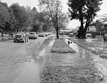 Buena Vista is situated on the east side of the Maury River at the western foot of the Blue Ridge Mountains. The Maury has a history of destructive floods damaging nearby communities. Particularly notable were floods on Oct 12, 1870, on the death of Robert E. Lee, when the Maury River provided Lee a temporary coffin due to a dock washed away up river (source: Library Virginia Military Institute), and in 1936, 1969, 1985 and 1995.[11] The Flood of '69 was the result of rainfall from the inland movement of Hurricane Camille. The Flood of '85 resulted from the convergence of three systems, including Hurricane Juan, which dumped tremendous amounts of rain on western Virginia.[12] The flood of record for the lower Maury River (downstream of the confluence with the South River), including Buena Vista and Glasgow, occurred on August 20, 1969, at a stage of 31.23 feet (9.52 m) on the Buena Vista gauge. (Flooding begins at 17.0 feet (5.2 m) and major flooding at 21.0 feet (6.4 m).[13]) The downtowns of Buena Vista and Glasgow were submerged in over 5 feet (1.5 m) of water.[12] The upper Maury River including Lexington saw its flood of record during the Flood of 1985 when the gauging station at Rockbridge Baths recorded a value of 19.19 feet (5.85 m) from flood marks.[14] The difference in flooding results from differing contributions of the South River depending on rainfall in the respective watersheds.