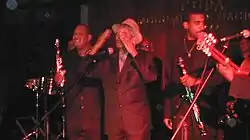 ![]() Carlos Calunga, Barbarito Torres and Idania Valdés performing with Orquesta Buena Vista Social Club in 2012 | |
