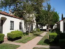 A bungalow court is a style of multi-family housing which features several small houses arranged around a central garden. The bungalow court was created in Pasadena, California in 1909 and was the predominant form of multi-family housing in Southern California from the 1910s through the 1930s. Homes in bungalow courts were generally small, low-rise houses in the spirit of bungalow design; however, the homes were designed in a variety of architectural styles, including Swiss chalet and Spanish Colonial Revival. Bungalow courts also integrated their courtyards with the homes, providing green space to homeowners.[1]